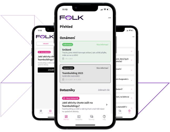 FOLK je mobilní aplikace, digitální pomocník do kapsy, díky kterému můžete posílat svým zaměstnancům oznámení, zprávy, sdílet novinky a dokonce provádět živé dotazníky.